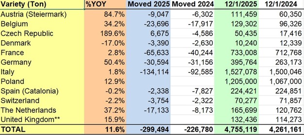 Die europäischen Apfel- und Birnenvorräte bleiben zum 1.12.2025 im Vergleich zum Vorjahr auf einem höheren Niveau, trotz stärkerer Bewegungen im Vergleich zum gleichen Zeitraum der letzten Saison. Die Lagerbestände variieren weiterhin stark von Land zu Land, was die Unterschiede in der Produktion, dem Tempo der Bewegungen und der Binnennachfrage widerspiegelt.