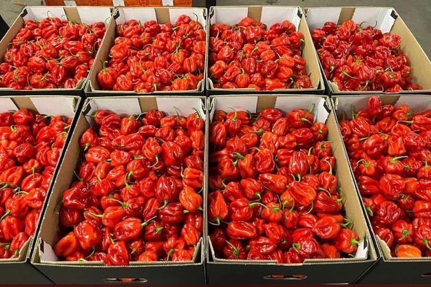 Rote Habanero-Paprika, bereit für den Export per Flugzeug