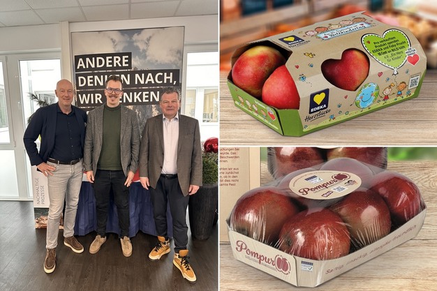 Im Uhrzeigersinn: Markus Ettlin, Leonhard Horsch, Frank Schuh; Kartonschale „Ein Herz für Kinder"; neu entwickelte Verpackung von Pompur – dem weltweit ersten zertifizierten allergenarmen Apfel .