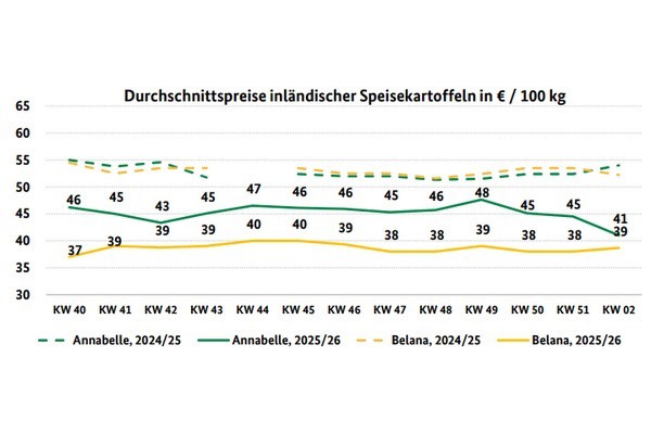 Zu Jahresbeginn bestand das Sortiment in weiten Teilen aus inländischen Speiselagerkartoffeln. Es konnte auf ein vielfältiges Angebot mit zahlreichen Varietäten zugegriffen werden. Flankiert wurden die einheimischen Partien durch französische Artikel. Im Bereich der Speisefrühkartoffeln gab es wenige zyprische und italienische Anlieferungen. Insgesamt verliefen die Geschäfte laut BLE recht ereignisarm, die Nachfrage wurde problemlos gedeckt. Dementsprechend mussten die Händler ihre bisherigen Forderungen nur selten korrigieren. Insgesamt liegen die Preise um 45,6 % unter dem Niveau des Vorjahres, bezifferte das Statistische Bundesamt.