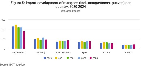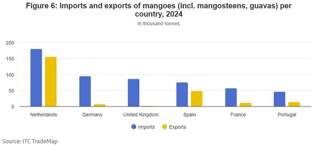 Mangos werden in immer größeren Mengen nach Europa importiert, was durch das ganzjährige Angebot aus verschiedenen Anbaugebieten und die steigende Nachfrage nach Früchten mit gleichbleibender Essqualität unterstützt wird. Europäische Verbraucher zeigen eine klare Präferenz für ballaststoffarme Sorten, insbesondere Kent und Keitt, und die Nachfrage nach Mangos, die als baumreif, verzehrfertig oder frisch geschnitten verkauft werden, steigt. Die wichtigsten europäischen Importmärkte für frische Mangos sind die Niederlande, Spanien, Deutschland, Frankreich und Belgien.