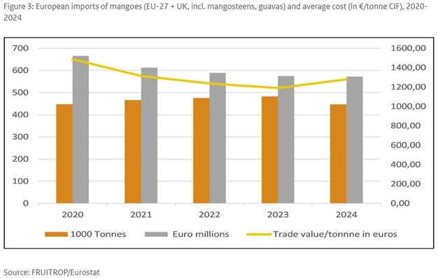 Europa ist weltweit der zweitgrößte Importeur von frischen Mangos. Die Nachfrage ist stabil und wächst weiter, unterstützt durch Werbeaktionen des Einzelhandels und einen Trend zu hochwertigeren Geschmackserlebnissen. Brasilien beliefert den europäischen Markt das ganze Jahr über, wobei Palmer, Keitt, Tommy Atkins und Kent die wichtigsten Export-Sorten sind. Osteen macht nur einen kleinen Teil der brasilianischen Exporte aus. Peru exportiert ausschließlich Kent-Mangos und ist für seine gleichbleibende Qualität bekannt, obwohl die Produktion in den letzten Saisons aufgrund von El Niño zurückgegangen ist.