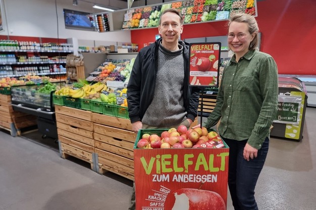 Annika Leistikow und Harald Rinklin in einem der Testmärkte im südwestdeutschen Vertriebsgebiet der Rinklin Naturkost GmbH. Der Bio-Großhandel hat sich gemeinsam mit BODAN Großhandel für Naturkost GmbH (Süddeutschland und angrenzende Regionen) als Vermarktungspartner am innovativen Konzept beteiligt.