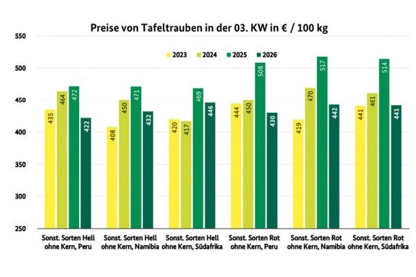 Importe aus Namibia, Peru und Südafrika bildeten die Basis des Angebotes. Die Anlieferungen aus Namibia hatten sich augenscheinlich verstärkt: Verschiedene IFG-Sorten wiesen laut BLE einen hohen Preis aus: So kosteten in Berlin etwas IFG 19, auch Candy Hearts oder Erdbeertrauben genannt, bis zu 9 EUR je kg. Für peruanische Autumn Crisp sollte man in Frankfurt bis zu 40 EUR je 8,2-kg-Steige bezahlen. Natürlich gab es auch deutlich günstigere Offerten, die in der Regel freundlich nachgefragt wurden. So tauchten in Hamburg Black Seedless aus Namibia auf, die zu 18 bis 20 EUR je 4,5-kg-Packstück untergebracht wurden.