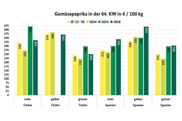 Spanische Paprika-Anlieferungen überwogen augenscheinlich. Ihre Präsenz hatte sich insgesamt zwar ein wenig ausgeweitet, dennoch fiel ihre Verfügbarkeit laut BLE relativ knapp aus. Die hohen Notierungen der Vorwoche blieben somit erhalten oder stiegen sogar noch etwas an. Die Nachfrage war daraufhin eher begrenzt. In der Folge sanken die Bewertungen der roten und grünen spanischen Offerten verschiedentlich ab. Die Präsenz der gelben Artikel blieb meist eingeschränkt, sodass die festen Preise Bestand hatten.