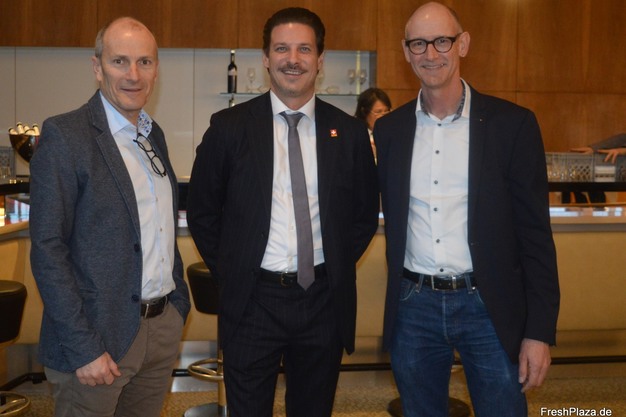 Christian Bertholet, Präsident von SWISSCOFEL, Stefan Marti, stv. Leiter der Wirtschaftsabteilung der Schweizer Botschaft, und Roger Mäder, Bereichsleiter Früchte, Kartoffeln und Logistik bei SWISSCOFEL.