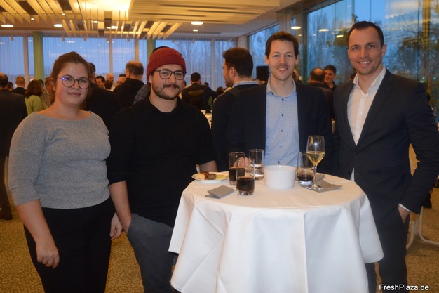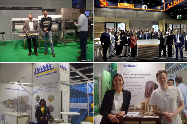Schweizer Aussteller auf der diesjährigen Fruit Logistica. Im Uhrzeigersinn: Visar Sorting, die Belegschaft der Kölla-Gruppe, das Team des Startups Noriware, und der Stand der Stöcklin Intralogistik AG.
