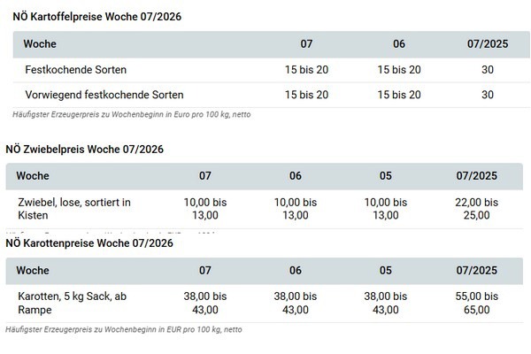 Am niederösterreichischen Karottenmarkt wird die bisher ruhige und stabile Situation fortgeschrieben. Im Inland können Karotten in saisonüblichem Umfang abgesetzt werden. Auch Exporte können laufend zu unveränderten Konditionen getätigt werden. Das Preisniveau weist daher keine Änderungen im Vergleich zu den Vorwochen auf. Zu Wochenbeginn wurde für Karotten im 5-kg-Sack, ab Rampe, je nach Qualität meist 38 bis 43 EUR je 100 kg bezahlt.