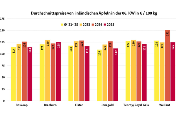 Inländische Chargen dominierten das Geschehen. Weiterhin standen vorrangig Jonagold, Elstar, Boskoop und Braeburn zur Verfügung. Italien schickte vorrangig Pink Lady, Golden Delicious und Granny Smith ins Rennen. Aus Frankreich kamen hauptsächlich Pink Lady und Jazz. Kleinere Abladungen aus den Niederlanden rundeten das Sortiment ab. Die Nachfrage zeigte sich punktuell freundlich.