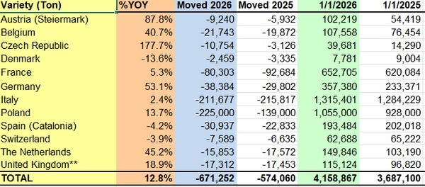 Die gesamten europäischen Apfelvorräte beliefen sich am 1. Januar 2026 auf 4.158.867 Tonnen, was einem Anstieg von 12,8 % gegenüber 3.687.100 Tonnen zum gleichen Zeitpunkt im Jahr 2025 entspricht. Der Anstieg spiegelt höhere Mengen in mehreren großen Anbauländern wider, trotz eines langsameren Tempos in der ersten Hälfte der Saison.