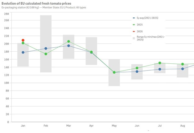 Der durchschnittliche Tomatenpreis im Januar 2026 in der Europäischen Union lag knapp über dem Rekordpreis vom Januar 2025. Laut einer Aktualisierung des Tomaten-Dashboards der Europäischen Kommission wurden durchschnittlich 2,09 EUR für ein Kilogramm Tomaten bezahlt.