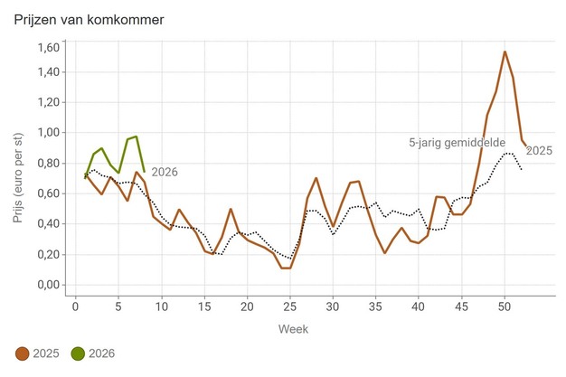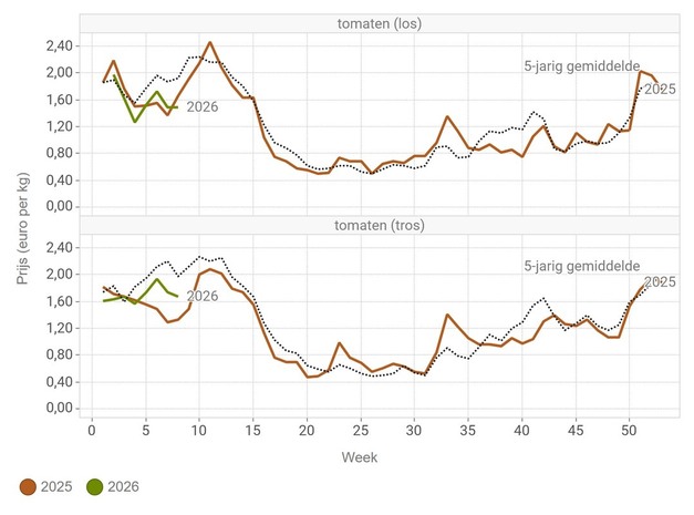 Bei in vielen Fällen deutlich geringeren Mengen liegen die Durchschnittspreise auf den Versteigerungen der Vereinigung belgischer Gartenbaugenossenschaften in KW 8 deutlich über denen des Vorjahres. Eine Ausnahme bilden Tomaten, deren Mengen zwar höher sind als im Vorjahr, deren Durchschnittspreis für Strauchtomaten jedoch mit 1,67 EUR/kg gestiegen ist. Lose Tomaten kosten 1,49 EUR/kg und sind damit günstiger als vor einem Jahr.