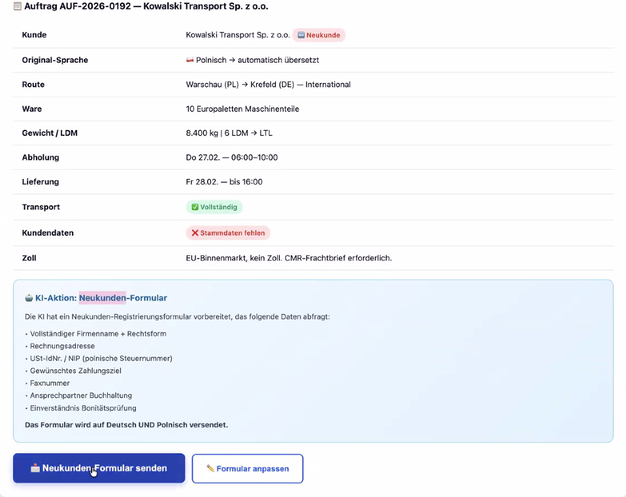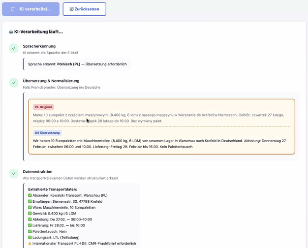 Mithilfe von Claude AI integrierte Hansult mehrere KI-Workflows in die Demo-Datenbank und erklärte an einem beispielhaften Szenario, wie die KI in Zukunft die Arbeit der Disponenten unterstützen könnte. In diesem Beispiel hatte ein polnischsprachiger Neukunde eine Anfrage geschickt. Die KI verarbeitete die E-Mail, indem sie die Sprache, in diesem Fall Polnisch, erkannte und ins Deutsche übersetzte. Danach listete sie die Daten strukturiert auf, überprüfte die Vollständigkeit mit Zollhinweis und führte einen Kundenabgleich im System durch. Am Ende erhalten die Mitarbeitenden eine Zusammenfassung mit Statusangabe und können mit einem Klick das Neukundenformular auf Deutsch und z. B. Polnisch verschicken.