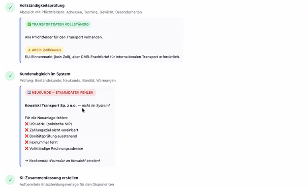 Weitere Arbeitsschritte der KI: eine Vollständigkeitsprüfung und der Kundenabgleich im System.