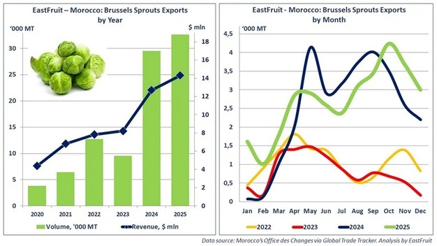Laut EastFruit hat Marokko im Jahr 2025 einen neuen Rekord bei den Exporten von Rosenkohl aufgestellt. Marokkanische Exporteure lieferten 32.600 Tonnen auf internationale Märkte und erzielten damit einen Umsatz von mehr als 14 Millionen US-Dollar. Dies entspricht einer Steigerung von 10 % gegenüber 2024 und einer 8,5-fachen Steigerung gegenüber 2020. In den vergangenen fünf Jahren betrug das durchschnittliche jährliche Exportwachstum 54 %.
