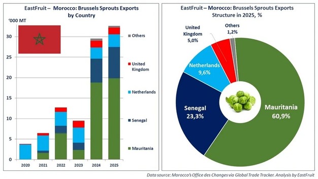Europa bleibt ein Absatzmarkt, wobei die Niederlande als Drehscheibe für den Reexport auf dem gesamten Kontinent fungieren. Das Vereinigte Königreich verzeichnet nach dem Brexit einen starken Anstieg der Importe aus Marokko. Die marokkanischen Exporte nach Großbritannien haben sich verzehnfacht und machen in bestimmten Monaten bis zur Hälfte der gesamten britischen Importe aus. Im Jahr 2025 entfielen 14,6 % der marokkanischen Rosenkohl-Exporte auf Europa.