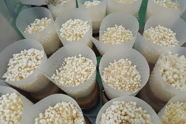 „Wir betreiben ein kontrolliertes Flaschenkultivierungssystem, das die Vorbereitung des Substrats, die Sterilisation, die Beimpfung, die Inkubation, die Fruchtbildung und die Ernte umfasst. Die Exportmengen unterliegen zusätzlichen Sortier- und Verpackungskontrollstandards. Der Prozess umfasst fünf wichtige Schritte. Zunächst erfolgt die Substratvorbereitung (auf Sägemehlbasis + Nährstoffe) und das Befüllen der Flaschen, dann die Sterilisation und Kühlung, um Kontaminationen zu reduzieren und die Inokulationstemperatur zu erreichen. Anschließend erfolgt die Inokulation mit Pilzbrut und die Inkubation (Myzelwachstum), gefolgt von der Fruchtbildung unter kontrollierter Temperatur/Luftfeuchtigkeit/CO₂ (die Umweltkontrolle hat einen starken Einfluss auf die Qualität der Enoki-Pilze). Zuletzt erfolgt die Ernte, Sortierung und Verpackung, bevor der Vertrieb in der Kühlkette beginnt."