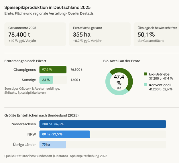 Die gesamte Erntefläche für Speisepilze belief sich im Jahr 2025 auf 355 Hektar, das waren 0,2 % mehr als im Vorjahr und 4,2 % mehr als im Durchschnitt 2015 bis 2024. Die Hälfte dieser Fläche (50,1 %) wurde ökologisch bewirtschaftet. Die Erntefläche für Champignons stieg gegenüber dem Vorjahr um 0,2 % auf 342 Hektar. Sie lag damit 3,8 % über dem zehnjährigen Durchschnitt der Jahre 2015 bis 2024.