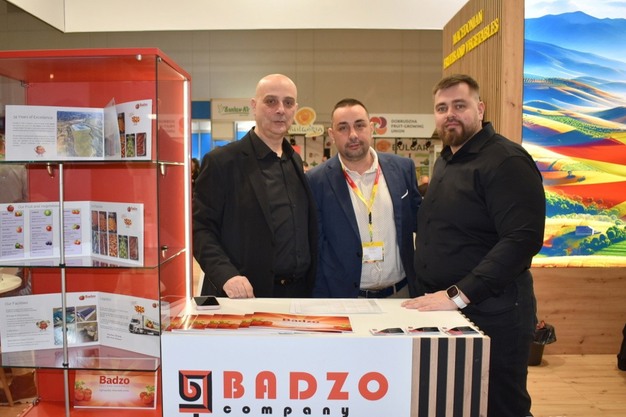© Fotis Karabetsos | FreshPlaza.deIvan Popov (links), Vasil Shapkarov (Mitte) und Anton Semenov (rechts) von Badzo auf der Fruit Logistica 2026.