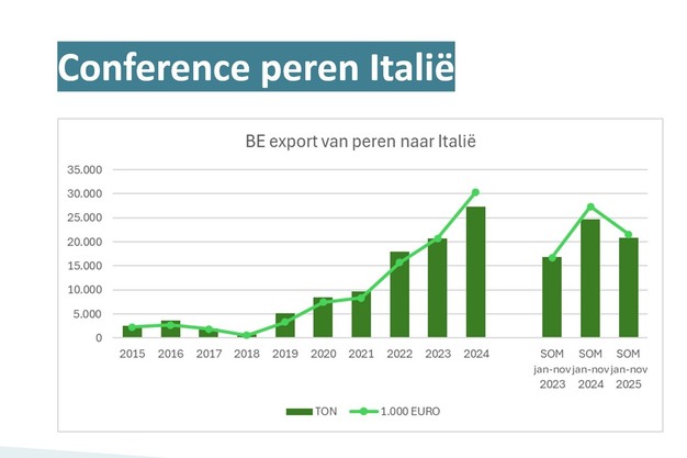 Der belgische Export von Conference-Birnen nach Italien befindet sich daher eindeutig im Aufwärtstrend. Laut VLAM bietet die aktuelle Marktsituation eine hervorragende Gelegenheit, dieses Wachstum weiter zu beschleunigen. Auf der Grundlage von Eurostat-Quellen zeigen Daten von VLAM nämlich, dass die Birnenimporte in den zurückliegenden zehn Jahren deutlich zugenommen haben, wobei die Bedeutung von EU-Ländern wie den Niederlanden und Belgien im Vergleich zu Drittländern erheblich gestiegen ist. So belaufen sich die belgischen Birnenexporte nach Italien mittlerweile auf fast 30.000 Tonnen, während sie vor zehn Jahren noch bei rund 3.000 Tonnen lagen.