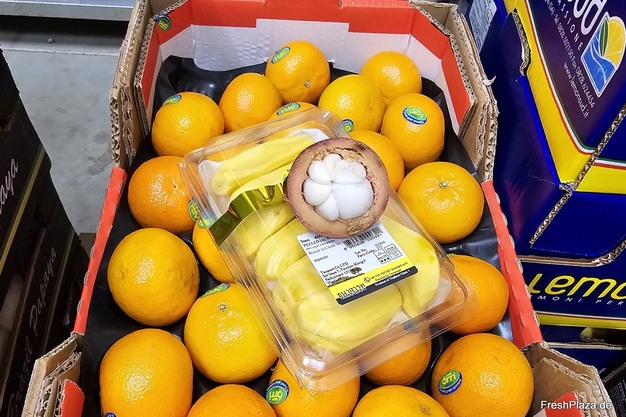 Eine aufgeschnittene Mangostan (oben) und portionierte, abgepackte Jackfruit. Mangostan stammt zurzeit aus Thailand.