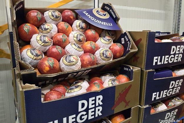 Sanguinelli-Blutorangen spanischen Ursprungs werden unter der beliebten Zitrusmarke 'Der Flieger' gehandelt.