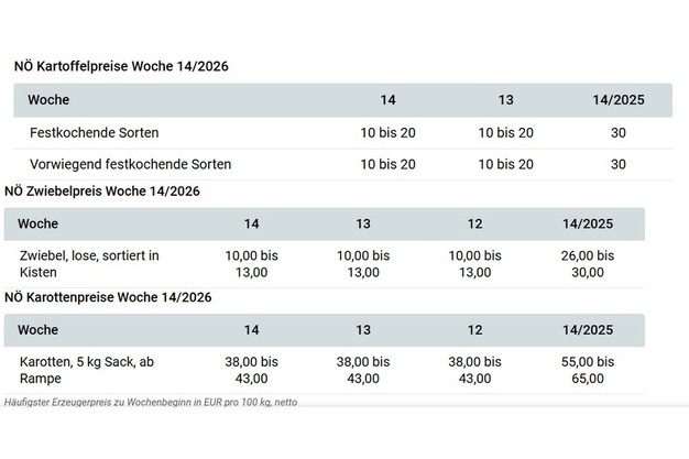 Der NÖ Karottenmarkt startet ausgeglichen in den April. Ein mittlerweile recht überschaubares Angebot trifft auf einen aufnahmefähigen Markt. Im heimischen LEH sorgt das nahende Osterfest für steigende Absatzzahlen. Auch Exporte können laufend in überschaubaren Mengen getätigt werden. Preislich stößt man dabei jedoch an Grenzen. Bei den Erzeugerpreisen gab es keine Änderung zur Vorwoche. Zu Wochenbeginn wurden für Karotten im 5 kg Sack ab Rampe je nach Qualität weiterhin meist 38–43 EUR/100 kg bezahlt.