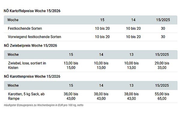 Im Export blieben die Absatzmengen trotz entsprechender Preiszugeständnisse hingegen enttäuschend: Bei den Preisen gab es keine Änderung zu den Vorwochen. In Niederösterreich wird für Vertragsware und für Premiumqualitäten unverändert bis zu 20 Euro/100 kg bezahlt, wobei Risikoabschläge sowie Abzüge für Logistikaufwendungen und Exportmöglichkeiten in Rechnung gestellt werden. Für freie Ware liegen die Preise deutlich darunter. Aus Oberösterreich wird ein stabiles Preisniveau von meist 15 Euro/100 kg genannt.