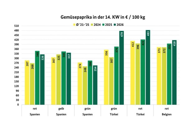 © BLEDie Notierungen der spanischen, niederländischen und belgischen Produkte tendierten laut BLE oftmals nach unten, tageweise aber auch teurer, was in Hamburg aber zu einer merklichen Kaufzurückhaltung führte. In München versuchten die Händler mittels Vergünstigungen, die Bestände der spanischen Erzeugnisse zu reduzieren. Rote inländische Spitzpaprika kosteten in Frankfurt 8,- € und Blockpaprika 7,- € je kg. In München startete die deutsche Kampagne mit ersten grünen Schoten.