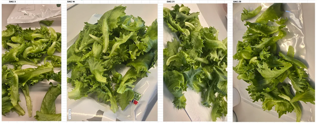 © Avisomo Crispi-Baby-Blattsalat, beprobt an den Tagen 3, 14, 21 und 28 nach der Ernte. Der optische Zustand blieb während des vierwöchigen Testzeitraums stabil, ohne sichtbare Bräunung, Texturverlust oder Anzeichen von Verderb.