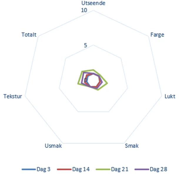 Ein Radardiagramm, das die sensorischen Eigenschaften über die vier Testzeitpunkte hinweg verfolgt, zeigt eine stabile Leistung. Die gemessenen Eigenschaften wie Aussehen, Farbe, Aroma, Geschmack, Fehlaroma, Textur und Gesamteindruck gruppierten sich eng um optimale Werte auf einer Skala von eins bis zehn, wobei eins für ideale Qualität steht.