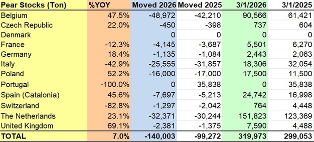 Die Birnenbestände in Europa stiegen im Jahresvergleich um 7,0 Prozent und erreichten zum 1. März 2026 319.973 Tonnen, verglichen mit 299.053 Tonnen im Jahr 2025.