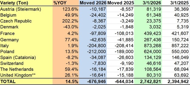 Die Apple-Bestände in Europa stiegen im Jahresvergleich um 14,5 Prozent und beliefen sich zum 1. März 2026 auf 2.742.821 Tonnen, verglichen mit 2.394.942 Tonnen im Vorjahr.