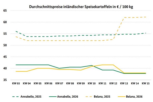 Die laufende Spargelsaison verbesserte punktuell die Unterbringungsmöglichkeiten. Insbesondere die Speisefrühkartoffeln wurden oftmals im Verbund mit Spargel angeboten. Generell konnte der Bedarf ohne Schwierigkeiten gedeckt werden. Die Geschäfte verliefen also laut BLE unisono in ruhigen Bahnen. Dies war auch bei den Speiselagerkartoffeln zu beobachten. Preisliche Veränderungen waren daher die Ausnahme.
