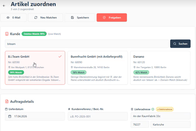 Vor dem KI-Matching finde ein lokales Matching statt und die KI greife erst ein, wenn kein Match zustande gekommen sei. Außerdem lernt das System während der Benutzung dazu. "Das System lernt, wenn manuelle Zuordnungen gemacht wurden, und merkt sie sich." Es speichere auch Affinitäten, wenn Kunden z. B. immer wieder ähnliche Bestellungen tätigen.