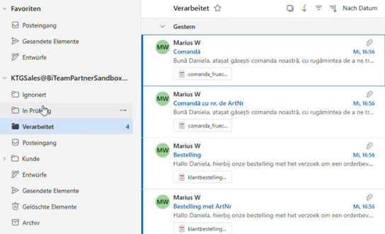 Danach zeigte Wessel ein Demo-Postfach, in dem drei unterschiedliche Ordner angelegt waren: verarbeitet, in Prüfung und ignoriert. "Es gibt zwei Stufen. Wenn ein bestimmter Schwellenwert erreicht wurde, dann wird eine Bestellung automatisch verarbeitet und im ERP direkt ein Beleg angelegt." Bei Sammel-Postfächern müsse man wissen, was von dem KI-Assistenten verarbeitet wurde, "deswegen werden diese Emails automatisch in die Ordner gelegt". Die Sprache der E-Mails spiele in der Verarbeitung keine Rolle.