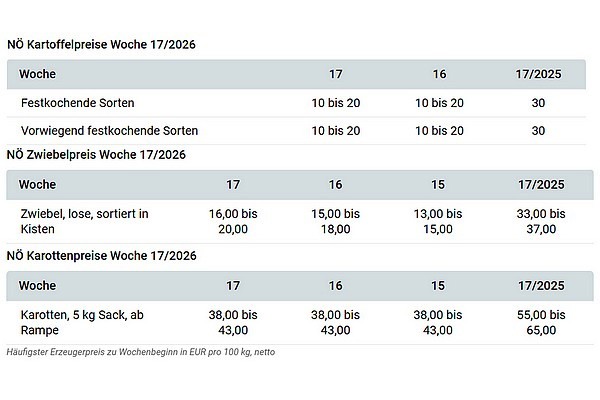 Bei den Erzeugerpreisen gibt es keine Bewegung. In Niederösterreich werden für Vertragsware und Premiumqualitäten unverändert bis zu 20 EUR/100 kg bezahlt, wobei Risikoabschläge sowie Abzüge für Logistikaufwendungen und Exportmöglichkeiten in Rechnung gestellt werden. Für freie Ware liegen die Preise deutlich darunter. In Oberösterreich blieb das Preisniveau mit 15 EUR/100 kg ebenfalls stabil.