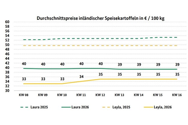 Neben dem weiterhin dominierenden hiesigen Speisekartoffelangebot der Ernte 2025 finden sich - wie üblich für diese Zeit - als Sortimentsergänzung auch Frühkartoffelimporte in den Regalen des LEH. Bei den Industriekartoffeln setzt sich die sehr schwache Markttendenz fort.