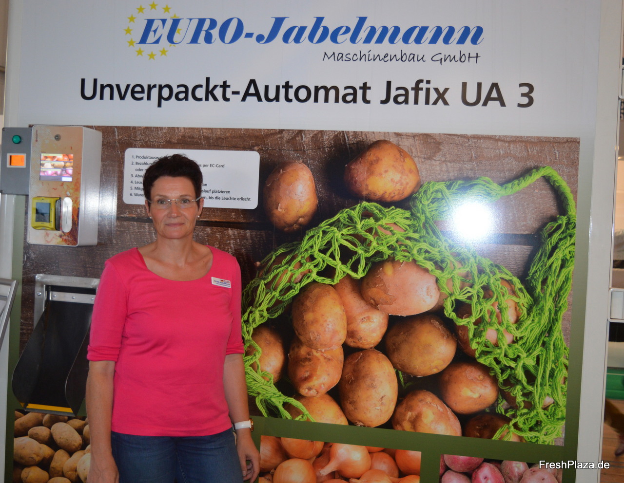 Gitti Veurink-Bosmann ist Geschäftsführerin des Maschinenbauunternehmens Euro-Jabelmann GmbH. Das Unternehmen stellte sowohl am Außengelände als auch im zentralen Zelt aus. Im Bild: Der neue Unverpackt-Automat aus dem Hause Euro-Jabelmann.