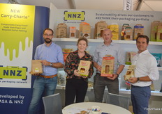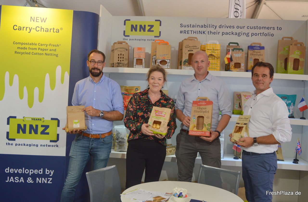 NNZ feiert in diesem Jahr 100-jähriges Jubiläum. Das niederländische Familienunternehmen verfügt über eine deutsche Zweigniederlassung und hat nun in enger Zusammenarbeit mit JASA eine zukunftsweisende Verpackunslösung für Kartoffeln namens Carry-Charta entwickelt. Im Bild: Stefan Thürling, Alies Padding, Guido Neumann und Marcel Pauw.