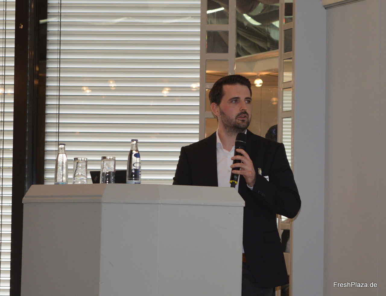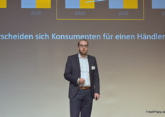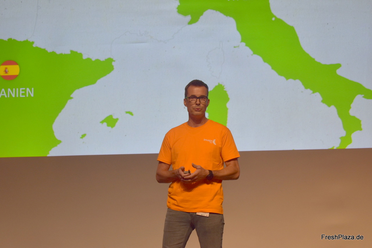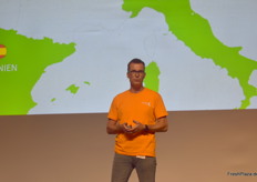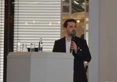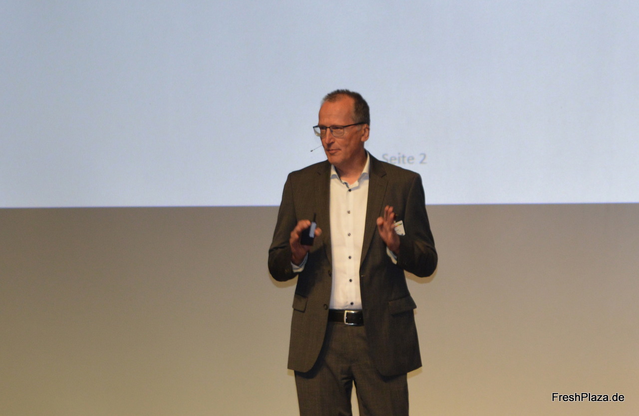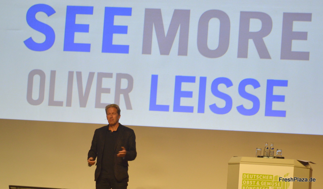 Oliver Leisse (SEE MORE Institute) wurde als erster Redner des Tages auf die Bühne gebeten und referierte an die zahleichen Herausforderungen mit denen die Fruchtbranche momentan zu kämpfen hat und wie man diese mittels Zusammenhalt und moderner Technologie in Zukunft bewältigen kann.