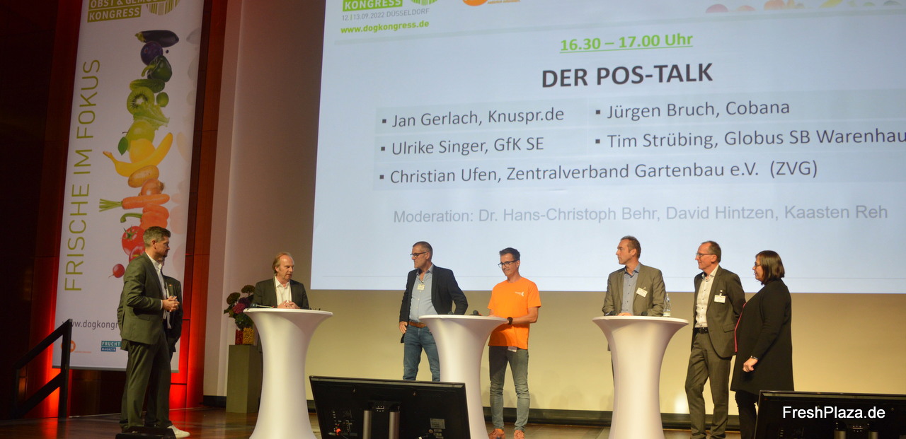 Abgeschlossen wurde der diesjährige DOGK mit dem sogenannten POS-Talk. Außer den drei Moderatoren nahmen fünf Branchenexperten und Repräsentanten der Lieferkette an der Diskussionsrunde teil, nämlich Jan Gerlach (Knuspr.de), Jürgen Bruch (Cobana), Ulrike Singer (GfK SE), Tim Strübing (O&G-Bereichsleiter bei Globus und Preisträger des Retail Awards 2022) sowie Christian Ufen (Kohlerzeuger und ZVG-Vorsitzender).