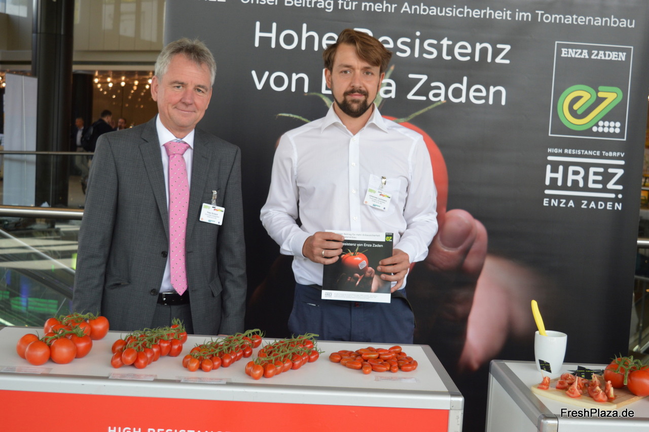 Peter Schlaich und Johannes Lachmann von Enza Zaden Deutschland. Der Gemüsezüchter hat es geschafft fünf Tomatensorten mit einer hohen ToBRFV-Resistenz zu entwickeln. Die Sorten eignen sich insbesondere für den Anbau in Nordwest- und Zentraleuropa.