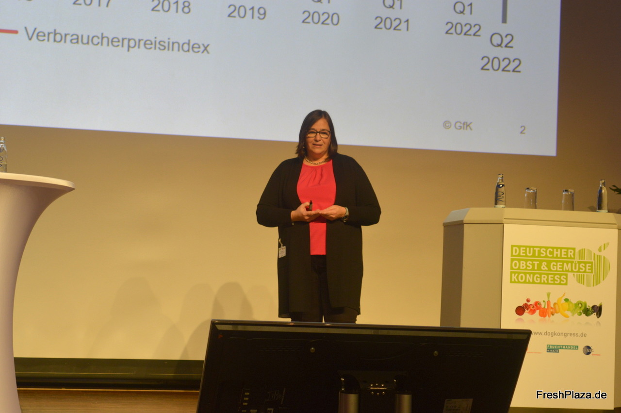 Nachdem sich GfK-Marktforscher Helmut Hübsch kürzlich in den wohlverdienten Ruhestand verabschiedete, präsentierte Ulrike Singer erstmals die heutigen Marktzahlen in Punkto Obst und Gemüse. Sie wies u.a. auf die Folgen der steigenden Inflationsrate auf das Einkaufsverhalten des Verbrauchers hin.
