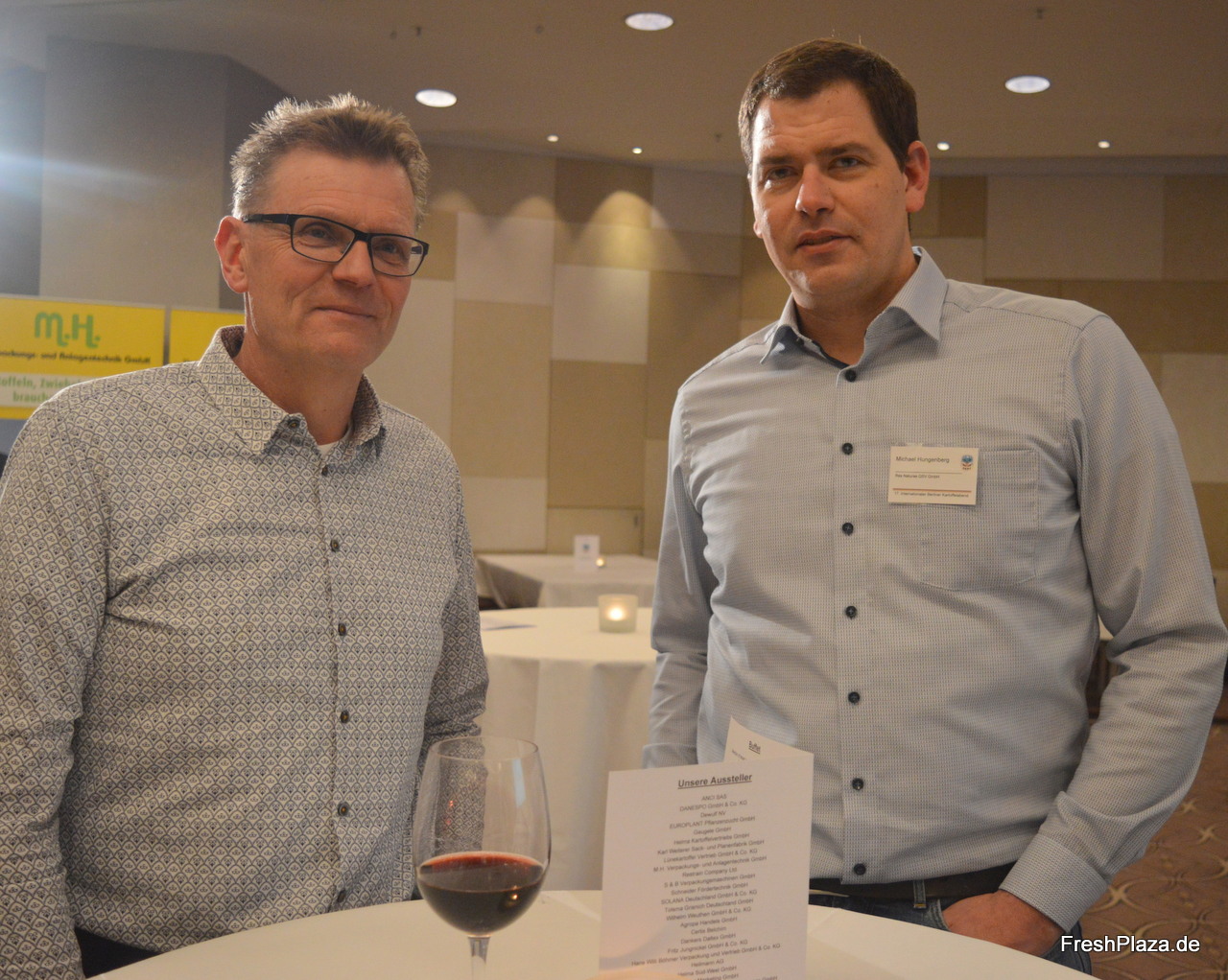 Hartmut Magin (l) von Pfälzer Grumbeere und Heinz-Josef Hüsgen (r) von Solana im Gespräch mit Kollegen.