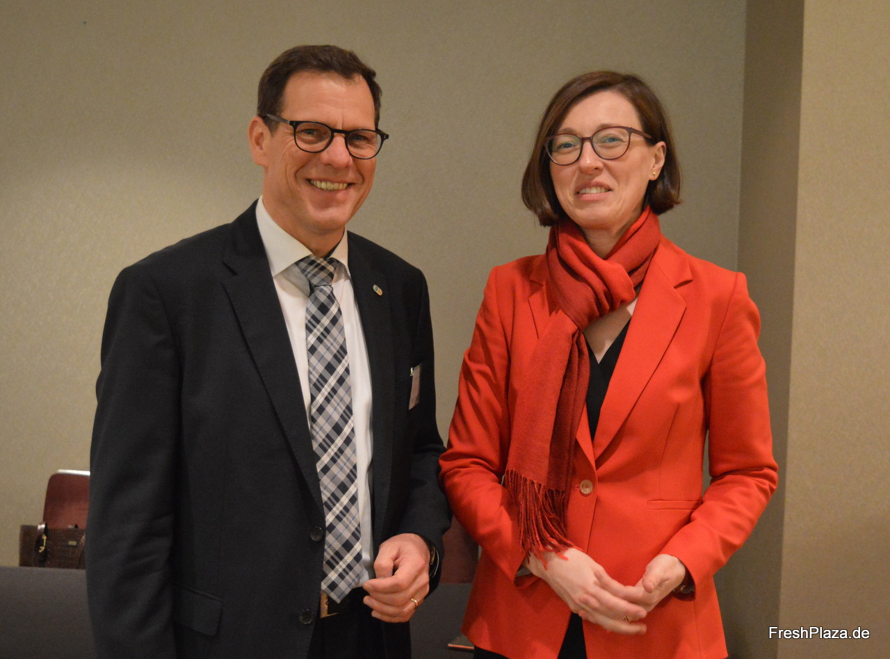Carine Lassalle und Harry Albus (ANCI) vermarkten innovative Zwiebel- und Kartoffelbeutel.
