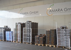 Aufgestapelte Paletten am Stand der Amara GmbH