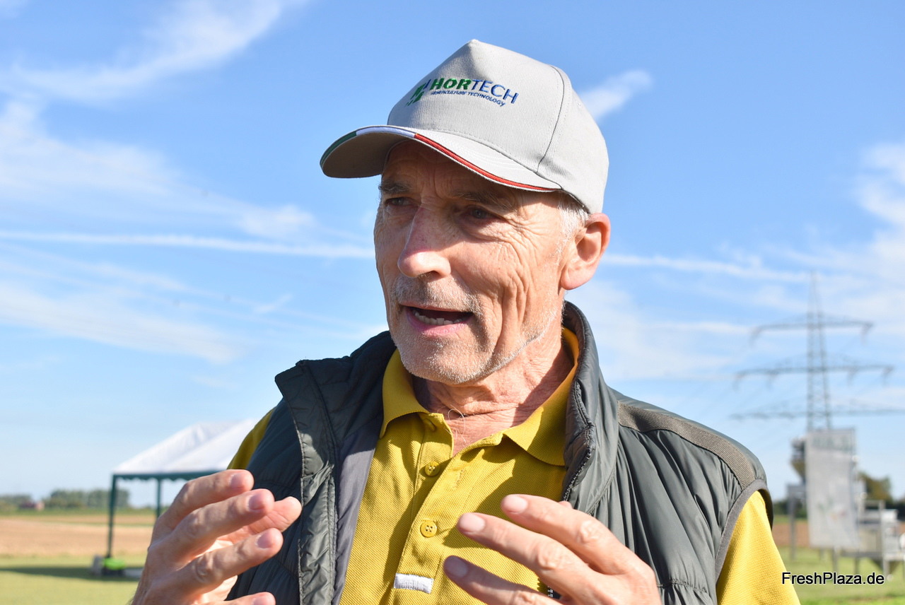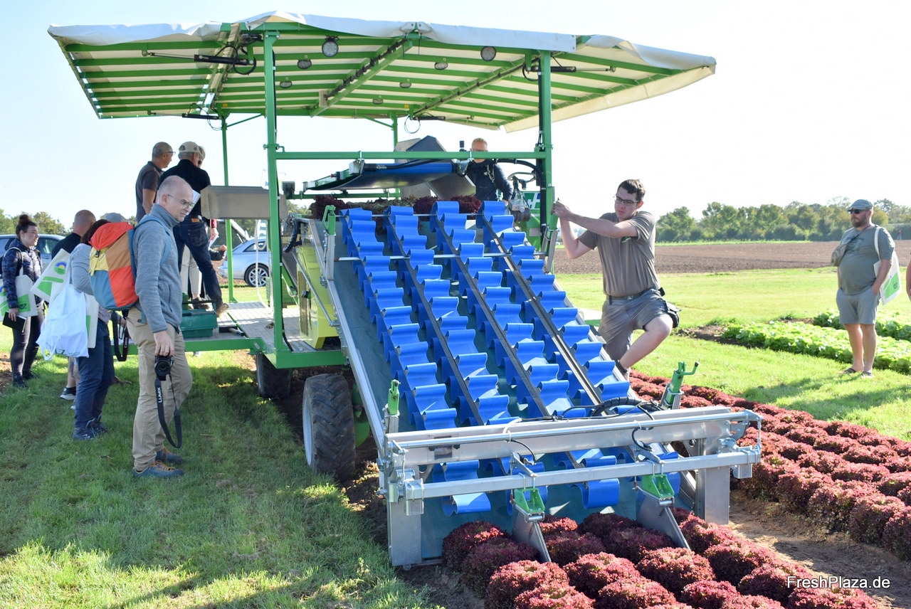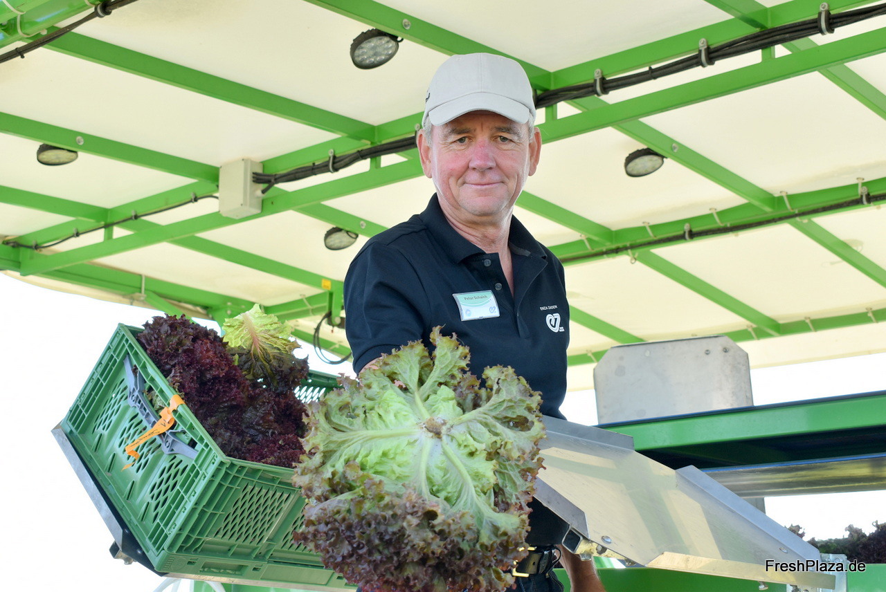 Product Manager im Bereich Salate Peter Schaich demonstrierte die Erntemaschine der Firma Hortech, die in Deutschland vom Unternehmen Trinkel vertrieben wird.