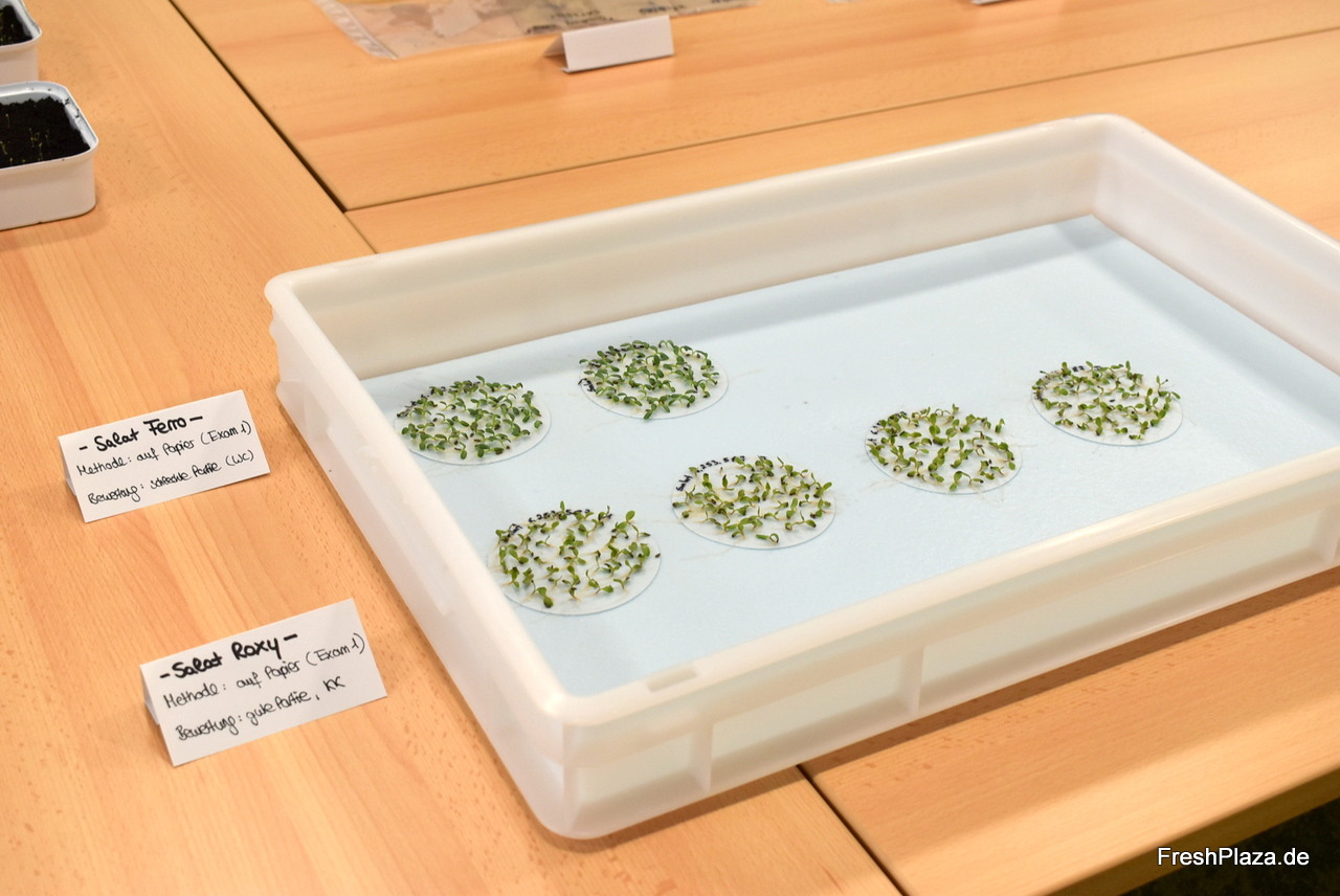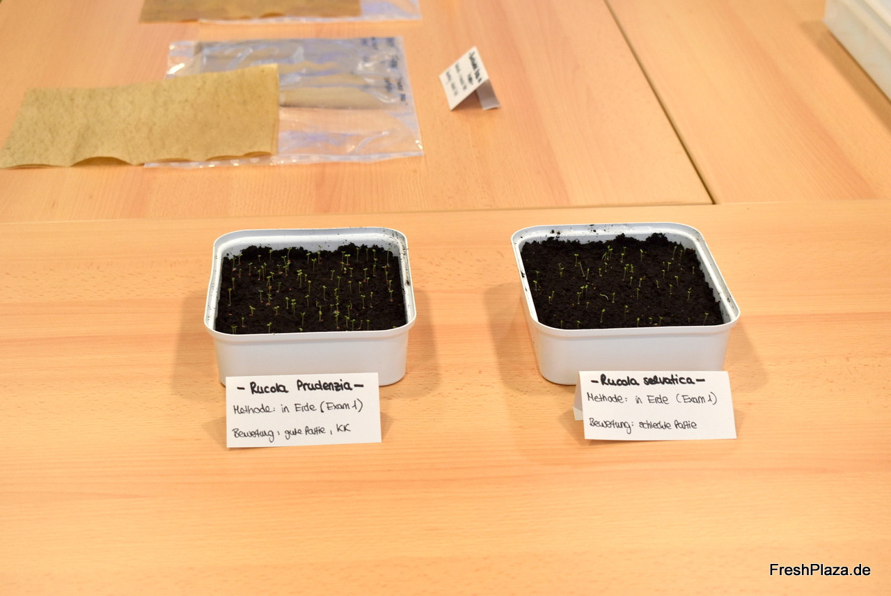 Im Keimlabor werden pro Jahr bis zu 4.000 Keimtests durchgeführt, so Dr. Rehfus. Über 60 Salat- und Kräutersorten werden am Standort Dannstadt getestet, hier etwa Rucola in Erde.