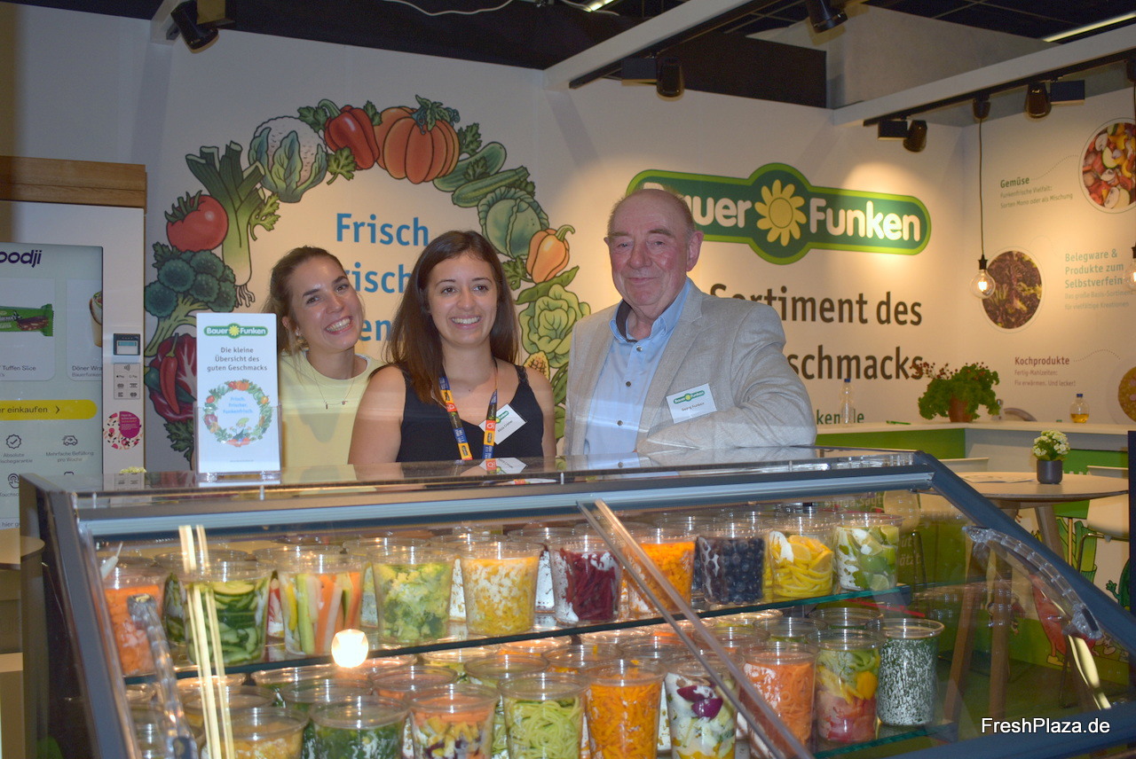 Alisa Flick von foodij am Gemeinschaftstand mit Produktmanagerin Alicia Cramer und Georg Funken von der Heinz Funken GmbH & Co. KG